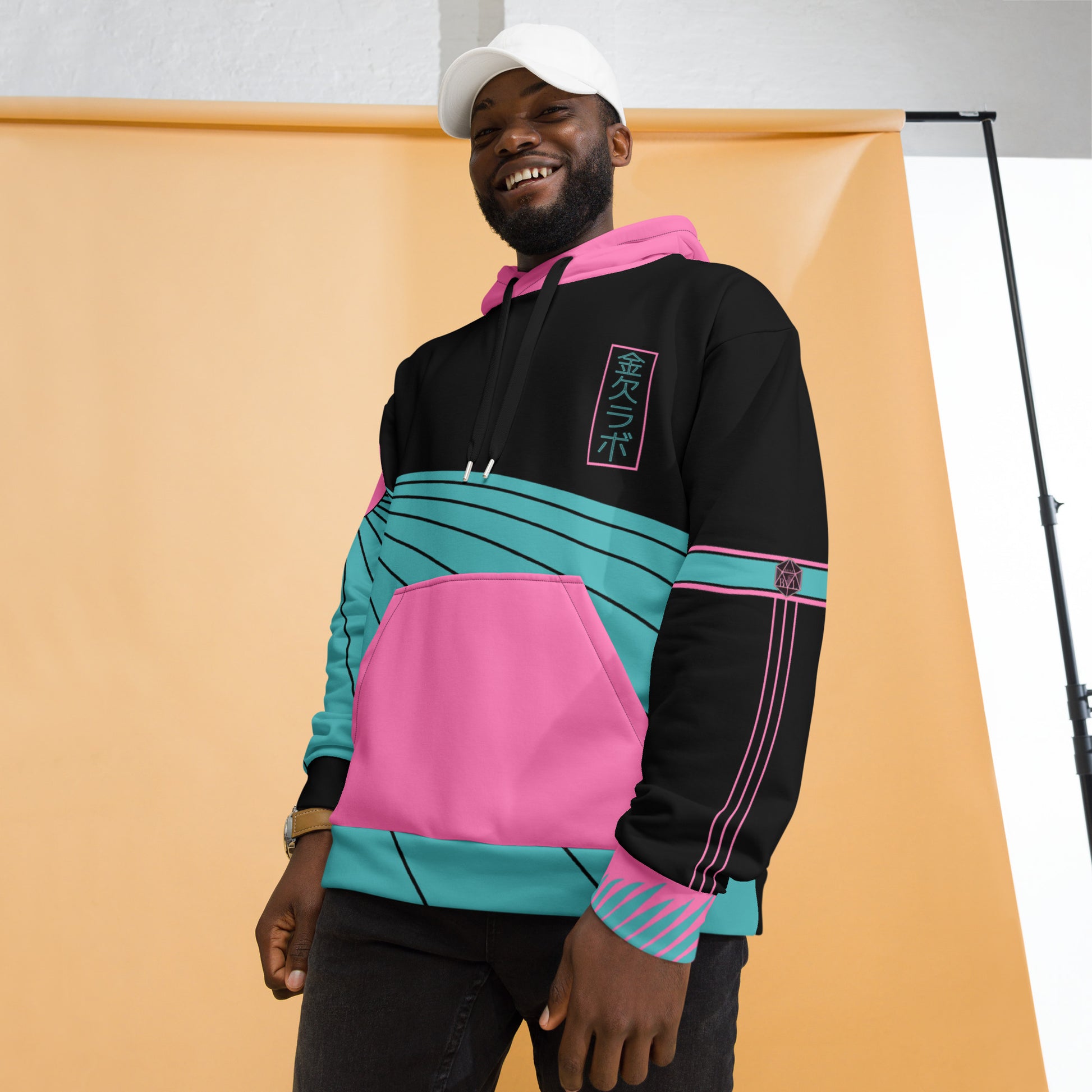 Comfy unisex hoodie with a soft outside vibrant classic vaporwave print and an even softer brushed fleece inside. Relaxed fit. All-over cyan colorburst with pink trim & palm cuff